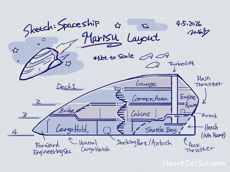 Arriing at a corner of the hangar, the group first catches a glimpse of the ship through the turbolift window. From the side, it resembles a low-heeled pump, but with thruster-equipped fins where the arch would be. According to the salesperson, the vessel features a four-deck structure with a capacity for about fifteen people. It's a luxury design, complete with an observation lounge on the top deck and even a holodeck.