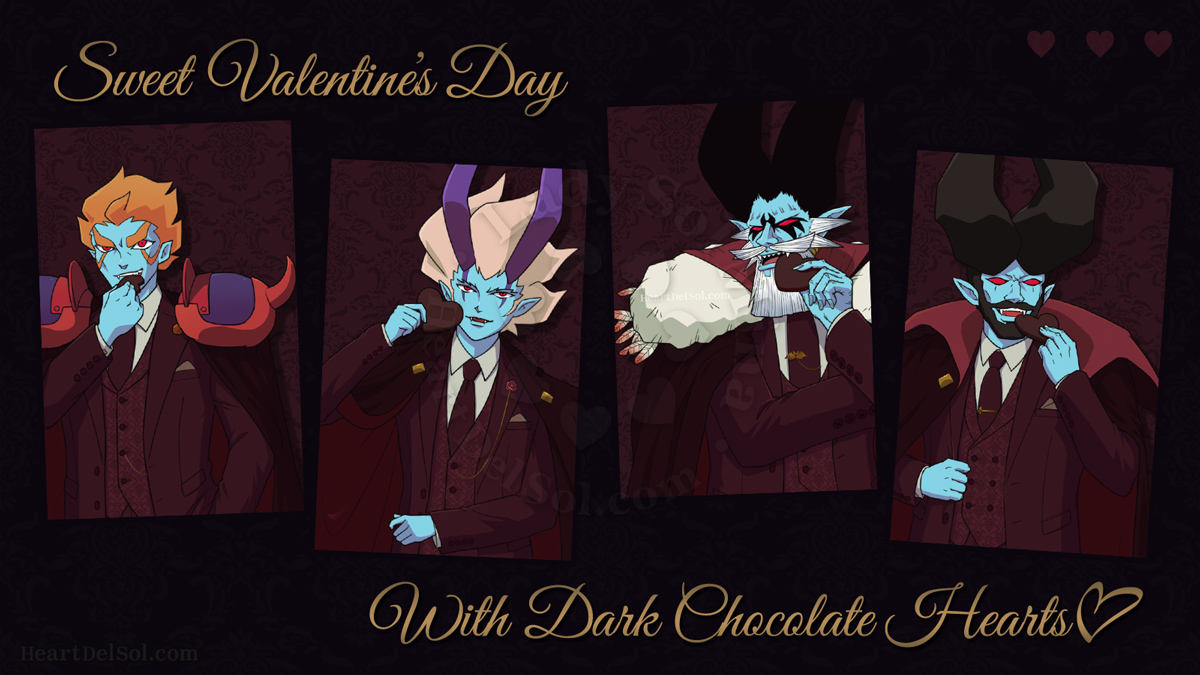 Happy Valentine's day for those who need dark chocolate to melt with sunlight♡ Now I'm back with a new digital drawing environment and here's some sweet gentlemen and boy I drew on my new PC. The background is a bat-damask pattern I made for this. Individual art and comments below. 新しいデジタル作画環境が整ったので、さっそくチョコレートが必要なボクタイ女子の皆様に紳士+αをお届けしたいと思います。太陽のような愛情を注げば溶けること間違いなし♡ 背景は今回のためにデザインした蝙蝠ダマスク柄となっております。下に個別の絵と駄文(コメント)を掲載しています。 |