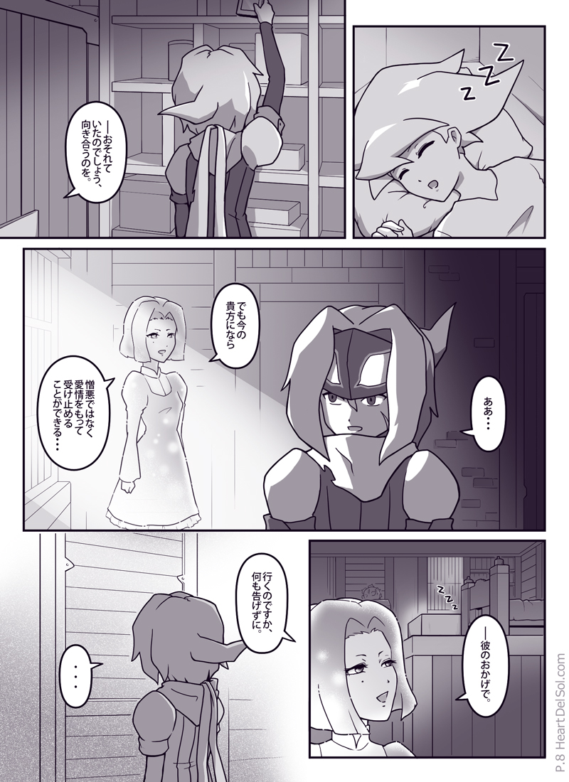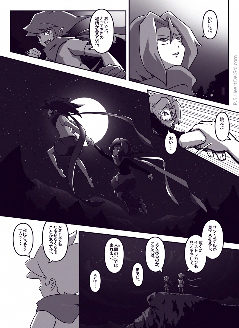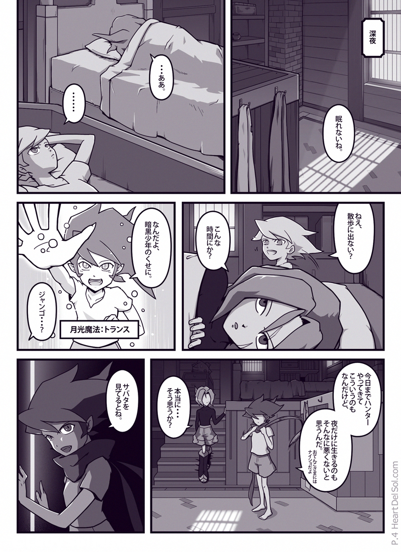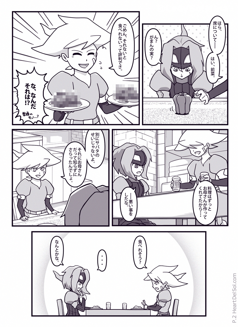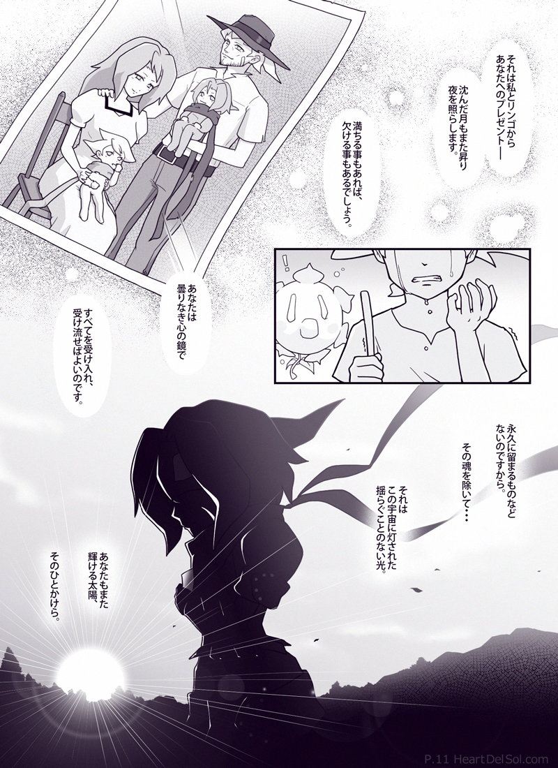 サバタの太陽(ソル)な面が描いてみたかった話。ジャンゴの手料理は食べる前から目に毒のようです。ページに収まらなかったのでカットしましたが、ガリガリ君は二人ともハズレ棒が出る予定でした。 気持ち英語も意識して書いた作品で、最後のリンゴのセリフを「My son(息子)」にして、「sun(太陽)」と同じ発音という余韻を残してみたりしています。 また「がまんの実」は英語版では「bear nut」と表記するそうで、bearには「我慢」のほかにも「担う・負う」や「子をもうける」といった意味もあり、それとなくジャンゴとマーニを示しているような…? ちなみに「太陽のひとかけら」を英語版では「a grain of...(一粒の・種子の)」としていまして、表題の[Tiny Sunny(小さな太陽)]もそこから来ています。 読んで下さった方ありがとうございました。 |