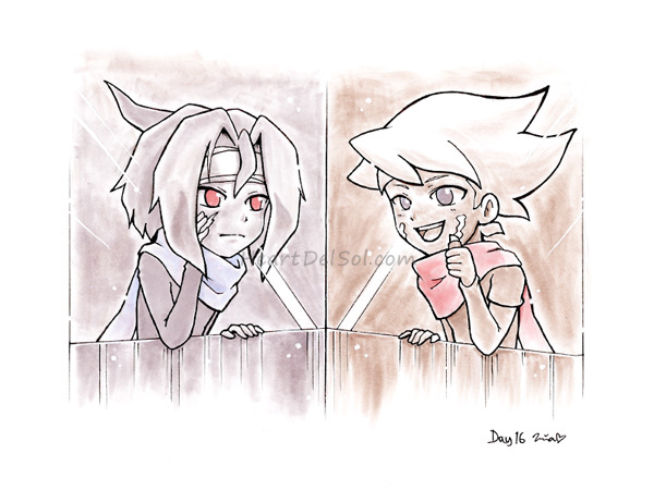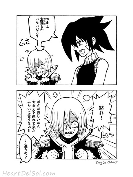Django will point out the same thing later. Thank the white ink, I could try to draw a comic with ink for the first time in ten years. ジャンゴにあってダーインになかったもの。ホワイトのお陰で十年ぶりくらいにアナログで漫画絵に挑戦してみる気になったのと、サバ兄の髪ベタが塗ってみたかった2コマ。無駄に長いダーイン語り(要ログイン?)と一緒に投稿してヒンシュクをかったり。 |
