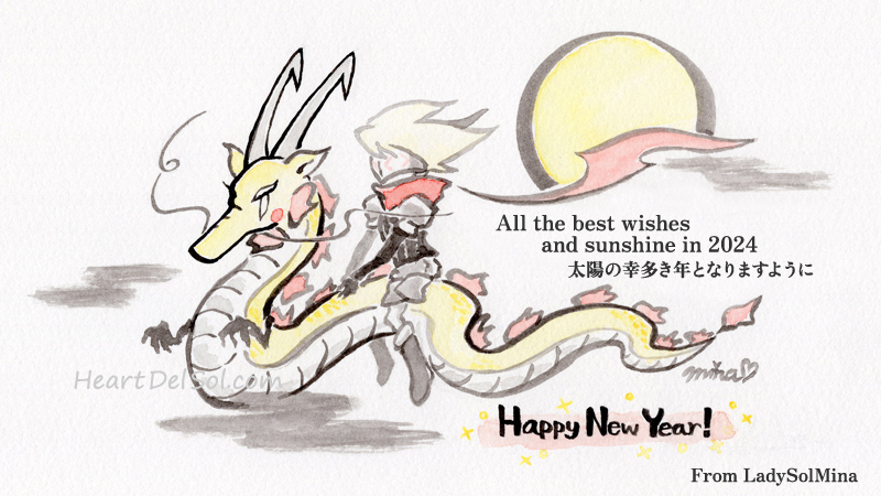 2024 is a year of the Dragon. According Bok3 guidebook, Master Otenko was designed in the motif of an seahorse, and Japanese name for seahorse is dragon's child. How about dragon Otenko instead of a seahorse? Even some wiki says nose, this is the reason why IT IS A MOUTH! おや、おてんこさまの様子が…おめでとう、おてんこさまは龍に進化した!墨汁じゃなくて水で溶いたインクで年賀状。おてんこさまのモチーフはタツノオトシゴということで、辰になって昇っていただきました。もうちょっと練習したかったけどもう松の内。後ろ足描き忘れたし汗。ジャンゴ~よい仔だねんねしな~♪ |