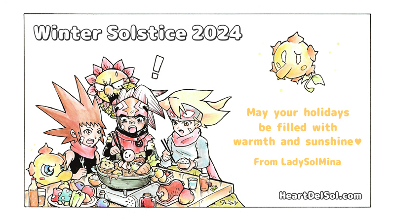 冬至のあいさつ、こたつマフラー。デジタル環境の不調でペンタブが使えない、ということで久々にアルコールマーカーでアナログ絵。アイテム欄の大掃除も兼ねて、名付けて[太陽闇ナベ]。 「も、餅巾着だよな…?」 |