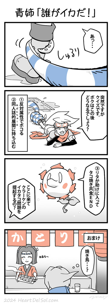 The official guidebooks didn't say it's a squid leg or octopus leg, but at least it's not Octopus (enemy). Don't you think that some fan says Dvalinn is a squid because of manga Django's doodle at the second episode...? Trivia: calamari means squid in Spanish, and karamari means tangle in Japanese. Wow🦑 「夜間の気温が上がってくると馬鹿なもの描きたくなる」シリーズ。実はタクティクスオウガネタ。イカのことをスペイン語で「カラマリ」と呼ぶらしい。なんかそれっぽい響き。ボクタイのクラーケン=イカの記述がないか探してみたけど攻略本には「足すべてで1匹分」としか書いてない。イカどころかタコですらないのか。定期的に青姉イカ説が上がってくるのは漫画版のジャンゴ画伯のせいかな…あれは伯爵にドヴァリン戦のフラグを立てたんだぞ(と言い張る)。 |